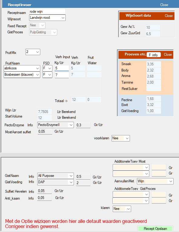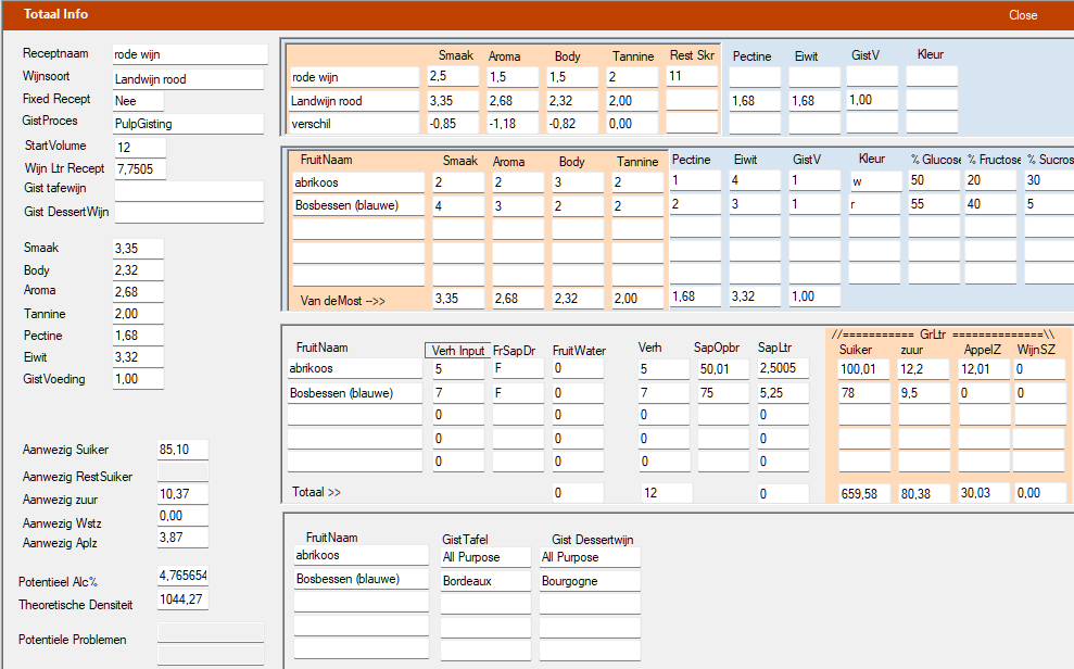 Met deze info kun je redelijk eventuele wijzigingen van fruit of fruitverhouding met betrekking tot smaak body en aroma beoordelen
